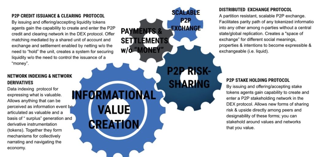 A partition resistant, scalable P2P exchange. Facilitates parity path of any tokenized information into any other among n-parties without a central state/global replication. Creates a “space of exchange” for different social meanings, properties & intentions to become expressible & exchangeable.